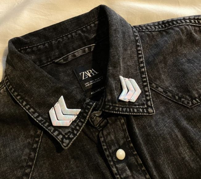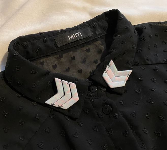 Bijoux de col tie and dye bleu vert et rose, en forme de chevrons, détails en acier inoxydable argenté, fermoir pin’s argenté. (la paire)