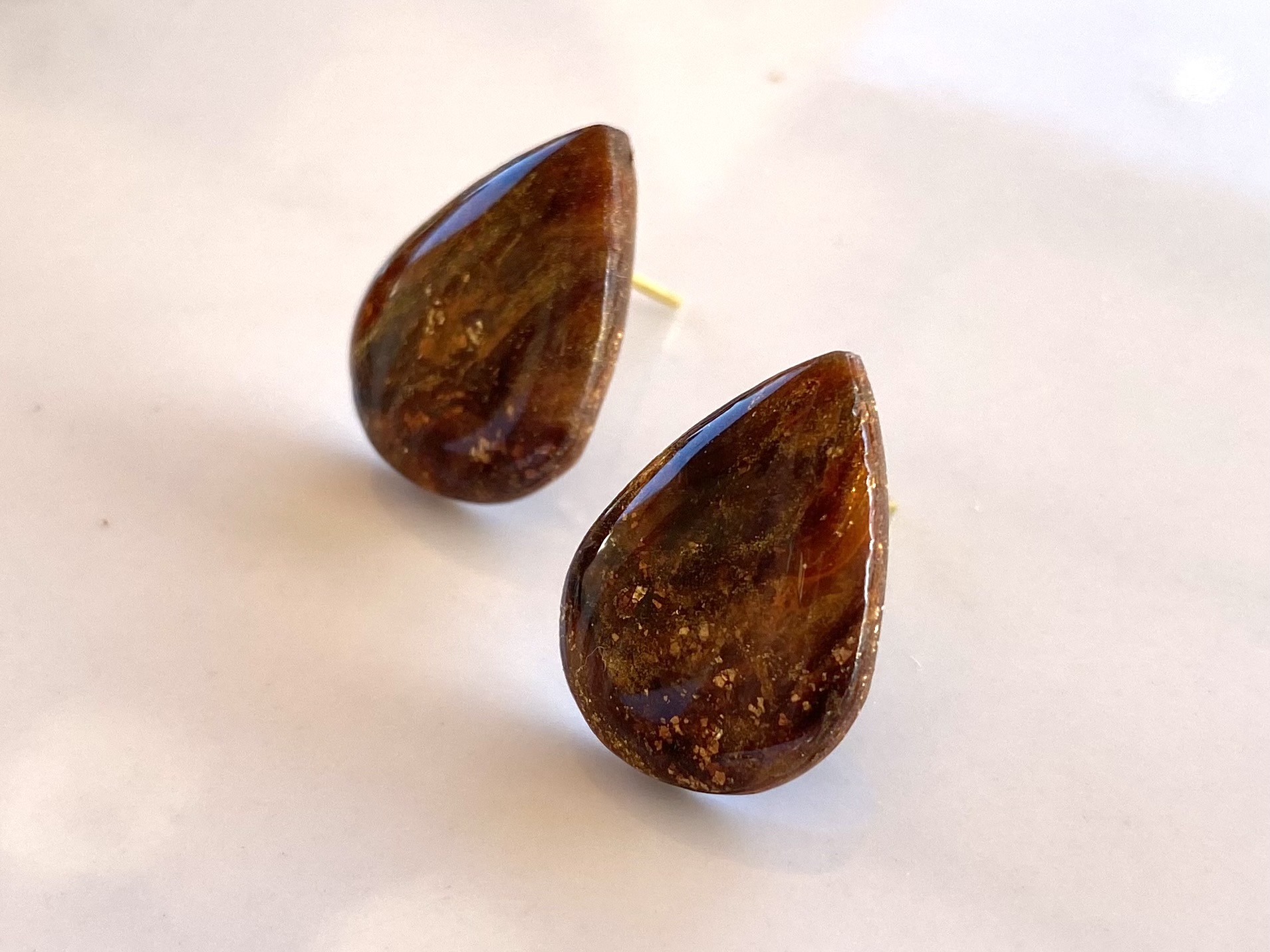 Boucles d’oreilles pendantes, en pâte polymère aspect œil de tigre – fermoirs et détails en acier inoxydable doré.