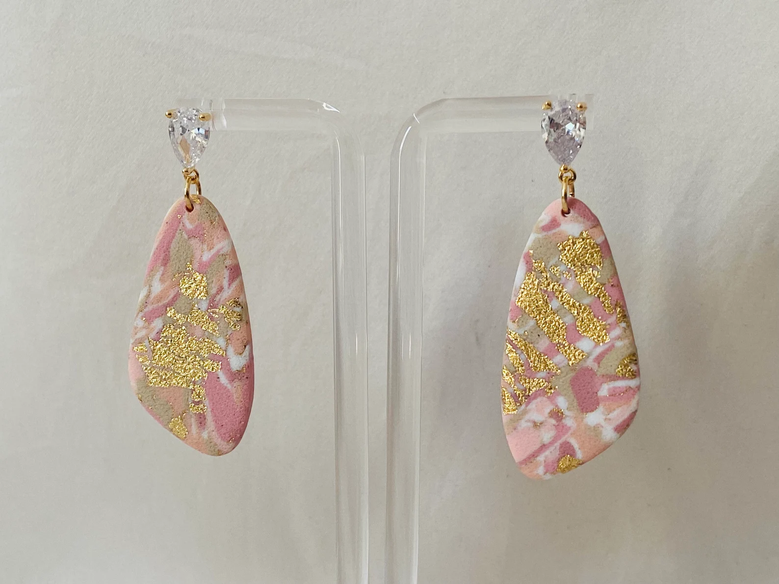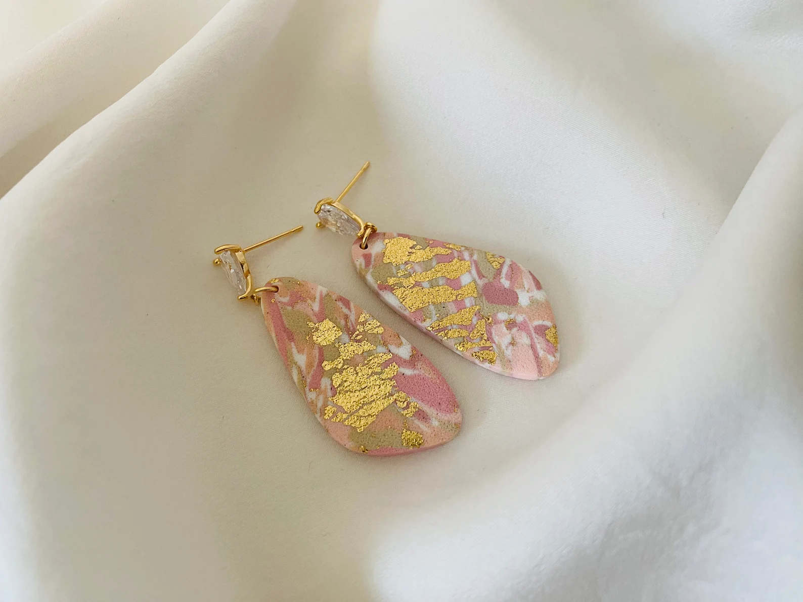 Ces bijoux sont soigneusement fabriqués à la main en utilisant de l’argile polymère et des fermoirs en métal doré sertis de zircon taille poire. C’est le petit plus élégant pour votre tenue.