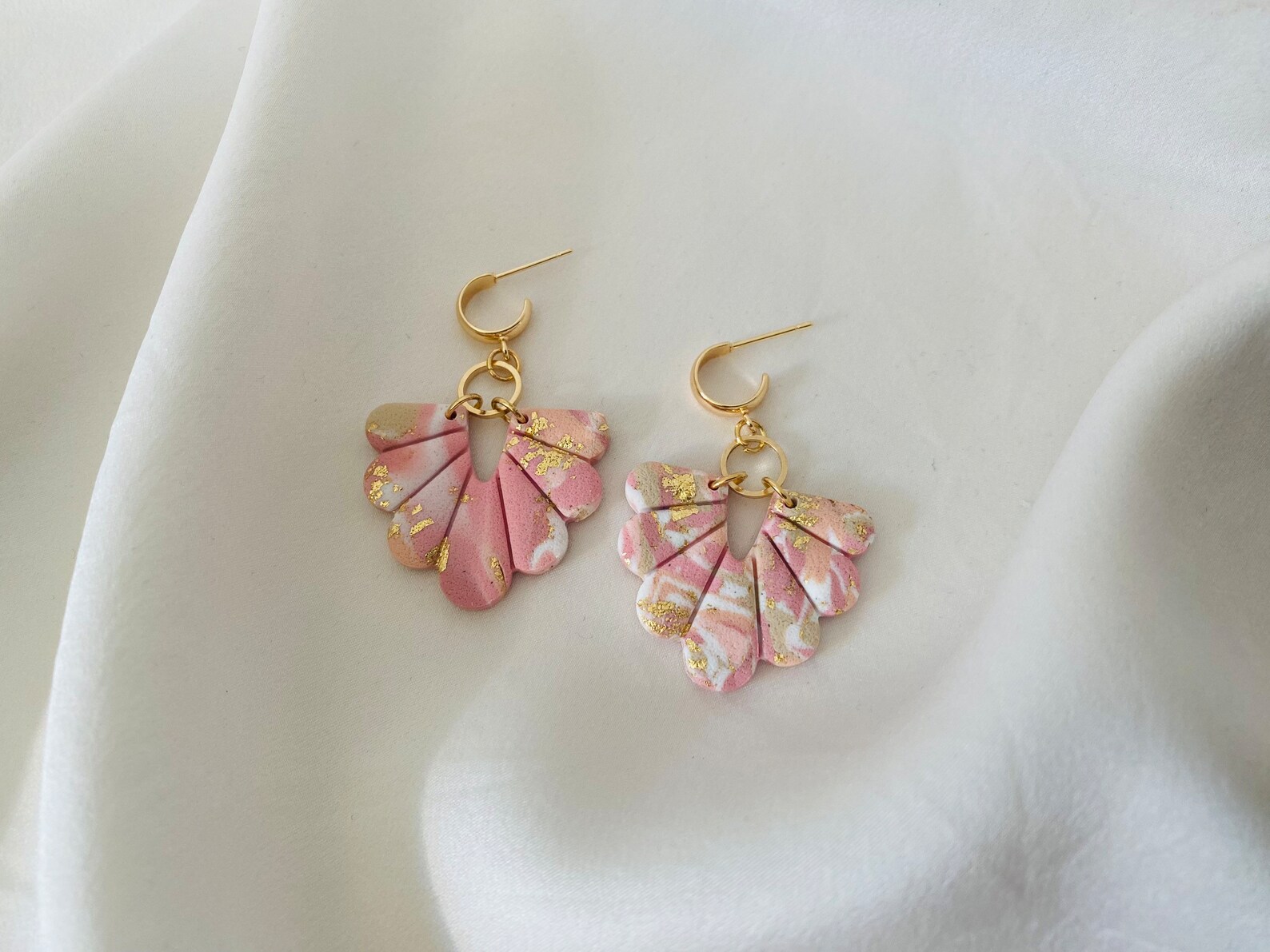 Boucles d’oreilles pendantes rose, nude et blanc, fermoir créole et détails en acier inoxydable doré.