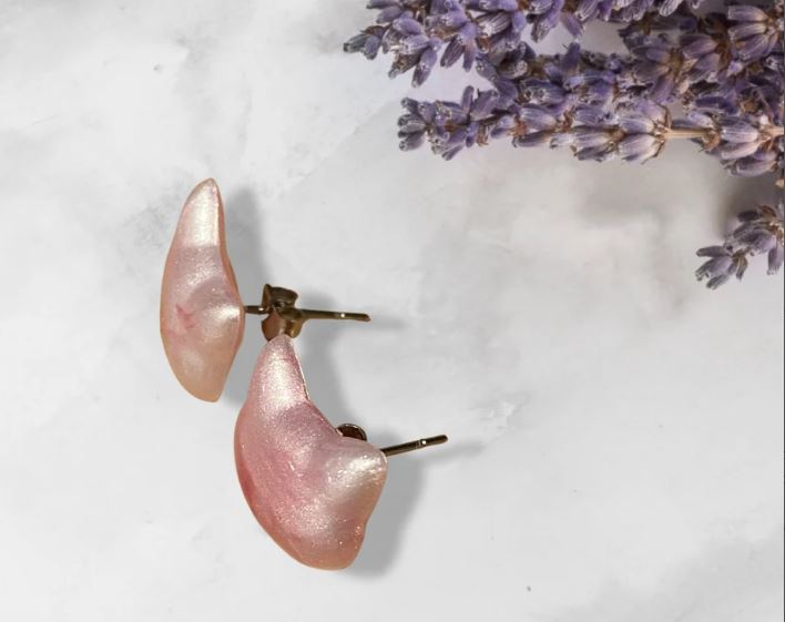 Paire de boucles d’oreilles puces/clous en résine, en forme de tête de chat, blanches et roses nacré.