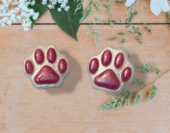 Paire de boucles d’oreilles puces/clous en résine, en forme de pattes de chat, blanches et roses nacré.